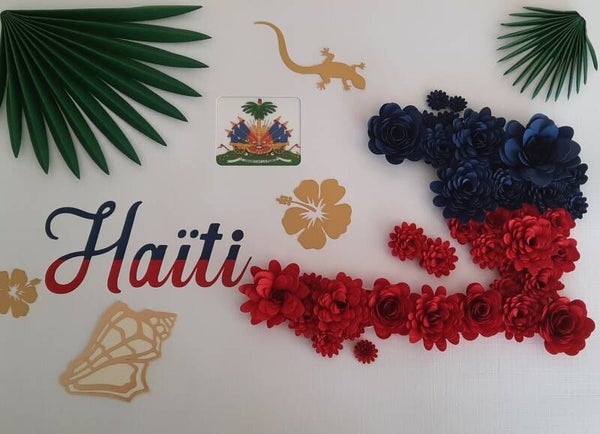 - Cadre en 3D qui met en avant la carte d'Haïti et son emblème. Les fleurs sont aux couleurs du drapeau Haïtien.