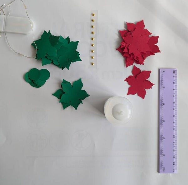 Des fleurs de poinsettia en papier à assembler sur une guirlande lumineuse, agrémentées de jolies demi-perles dorées autocollantes pour une touche élégante et festive 🌟